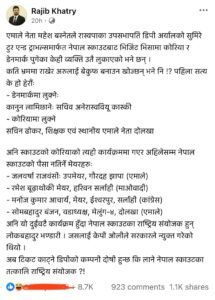 उदाहरणका लागि, फेसबुकमा केही पोस्टहरूमा उनलाई ‘स्काउटको कोरिया कार्यक्रममा गएर पैसा नतिरेको’ भन्दै सूची सार्वजनिक गरिएको छ ।